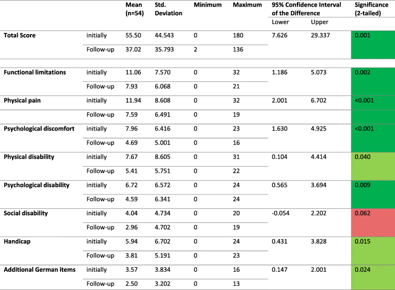 - OHIP-G scores for patients with fascial space abscesses in comparison. Light green = significant difference (p = < 0.05), dark green = highly significant difference (p = < 0.01), red = no significant difference